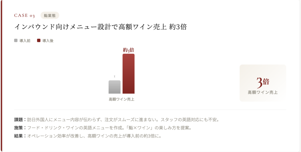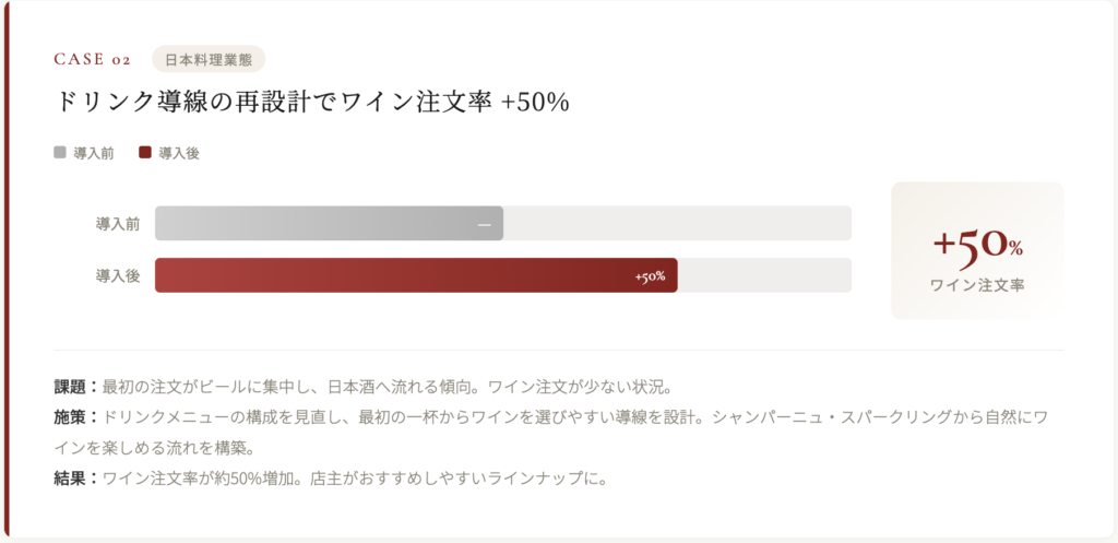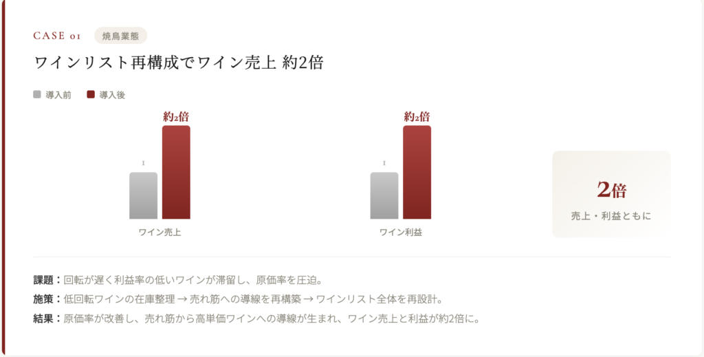 提案してもらったワインでジュヴレ・シャンベルタンが今でも1番出ます。ワインは2倍くらいには増えたかなと感じます。