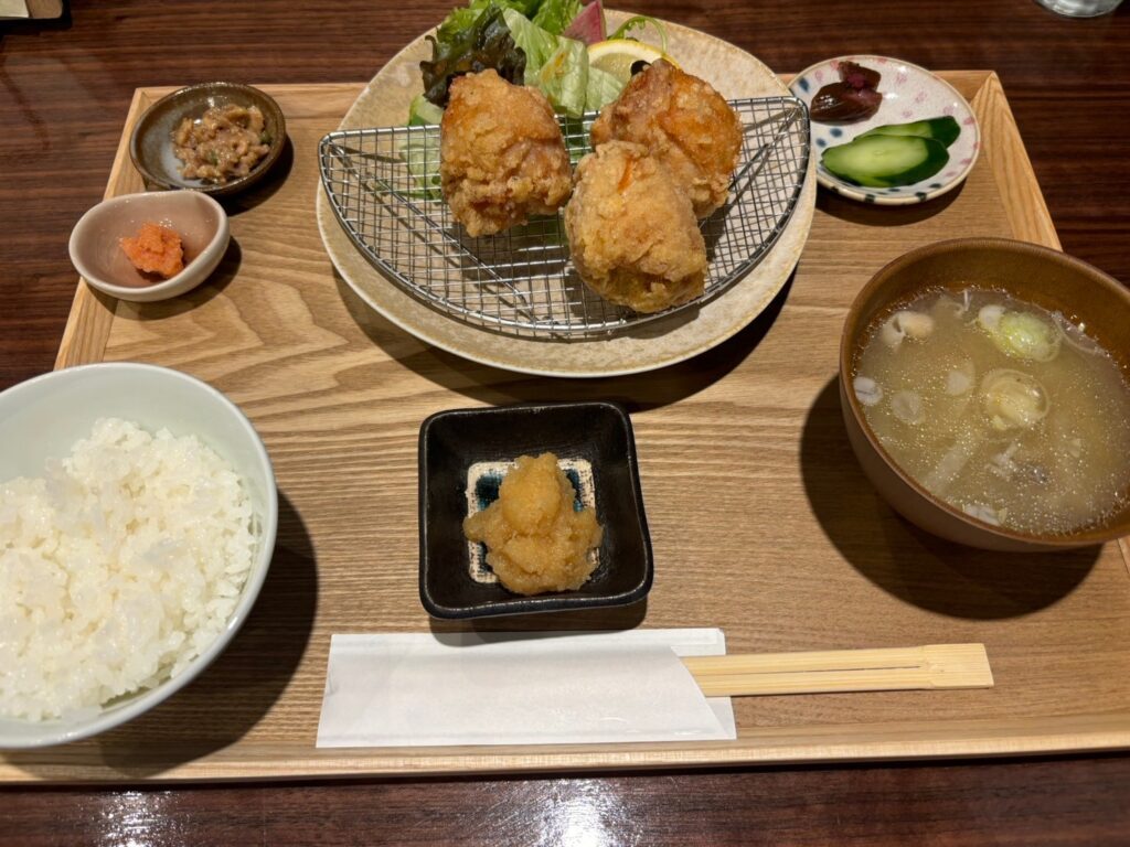 鳥せいで定番の、鳥皮で肉を包んだジューシーで大きな唐揚げがランチで頂ける!